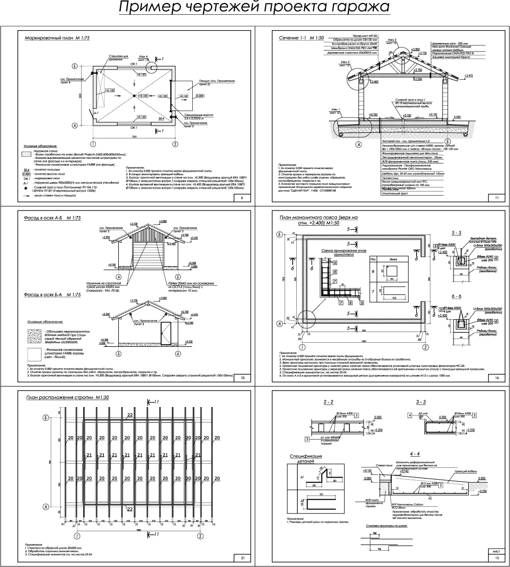 Гараж спроектирован из газобетона. Несущие наружные стены толщиной 300 мм без утепления с покрытием штукатуркой (при желании фасад можно утеплитель минераловатными плитами без изменения проекта). Фундамент - монолитная железобетонная плита. Поверх неё запроектирована утепленная стяжка с контуром электрического теплого пола (для возможности отопления гаража). Перекрытие по деревянным балкам с утеплением минеральной ватой (на высоте 2,4 м). Кровля двускатная по деревянным стропилам с покрытием проф.листом.