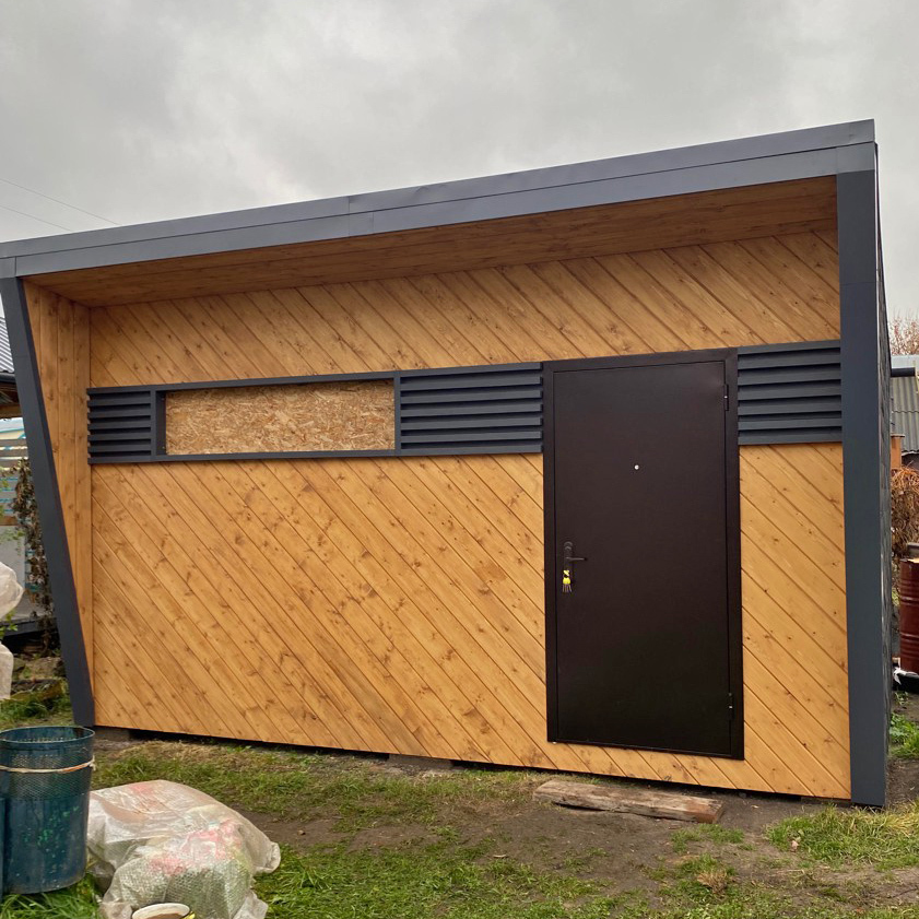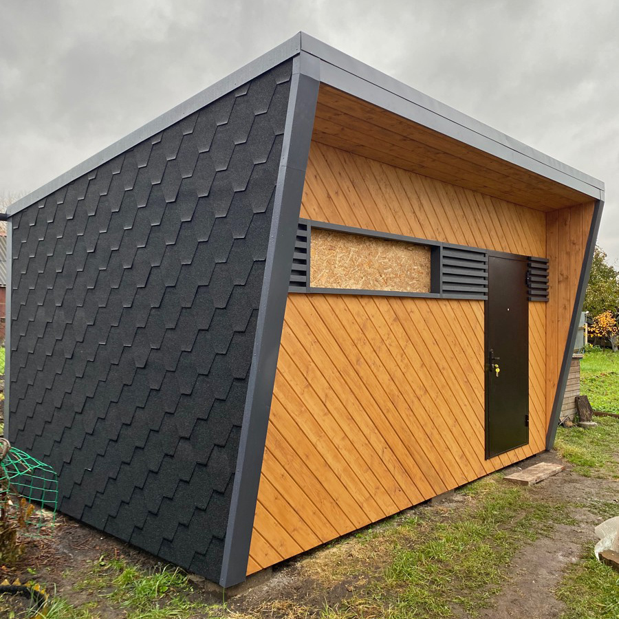 Проект каркасного хозблока К-35. Архитектура выдержана в современном скандинавском, минималистичном стиле. Хозблок может быть использован для хранения вещей, садовой техники и инвентаря, а также в качестве мастерской.